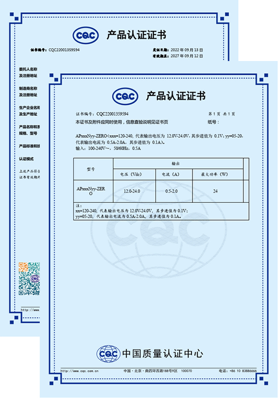 熱烈祝賀我司AP120N20-Zero、AP150N16-Zero、AP200N12-Zero、AP240N10-Zero等型號AC-DC電源模塊順利通過CQC認證,提高了產(chǎn)品競爭力和企業(yè)形象,增強客戶對產(chǎn)品的信心。